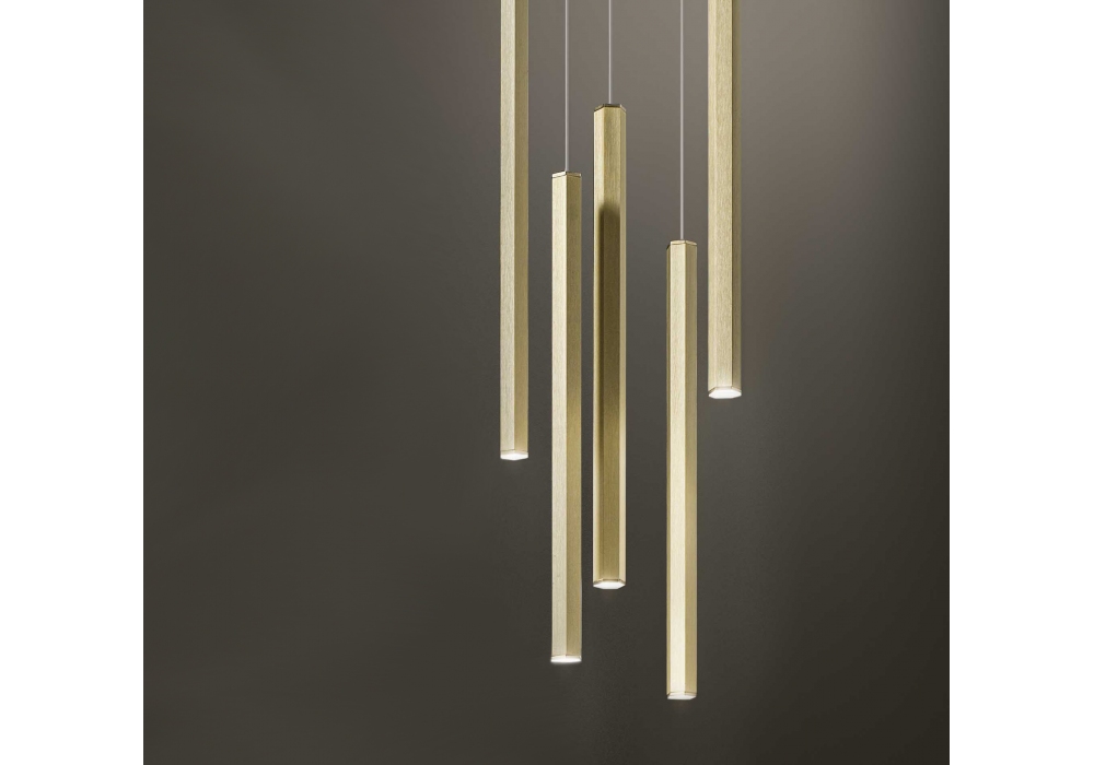 Shine Vertical firmata da Michele Marcon per Olev è una lampada a sospensione a LED in ottone. Driver incluso.