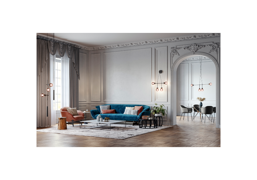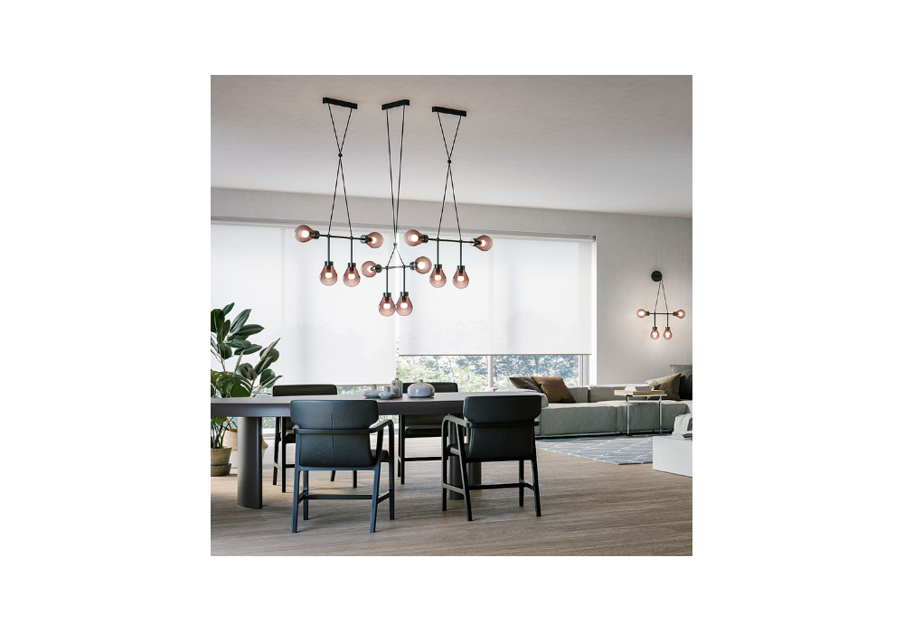 Zoe 7383 firmata da Chiara Andreatti e Studio Salaris per MMLampadari è una lampada a sospensione in metallo verniciato colore carbon black e diffusori in vetro fumè rosato; disponibile in diversi modelli.