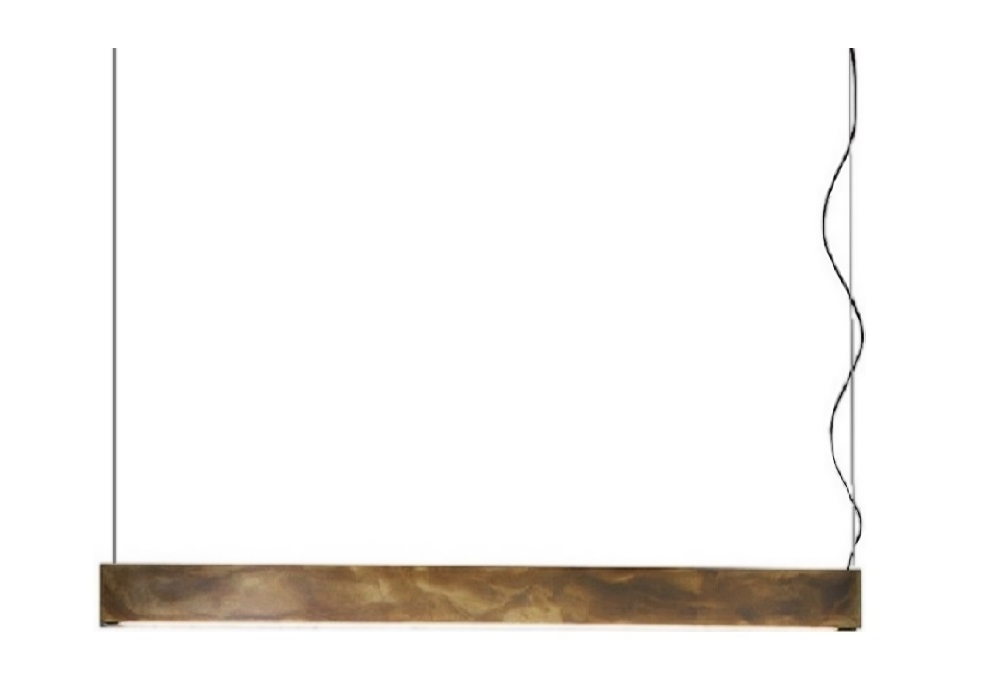 Code 7381/1-01 M firmata e prodotta da Ufficio Tecnico MMLampadari è una lampada a sospensione costituita da due linee luminose, con struttura interna color nero opaco e finitura esterna disponibile in tre varianti: ottone ossidato, ferro decapato, rivestimento in pelle nera.