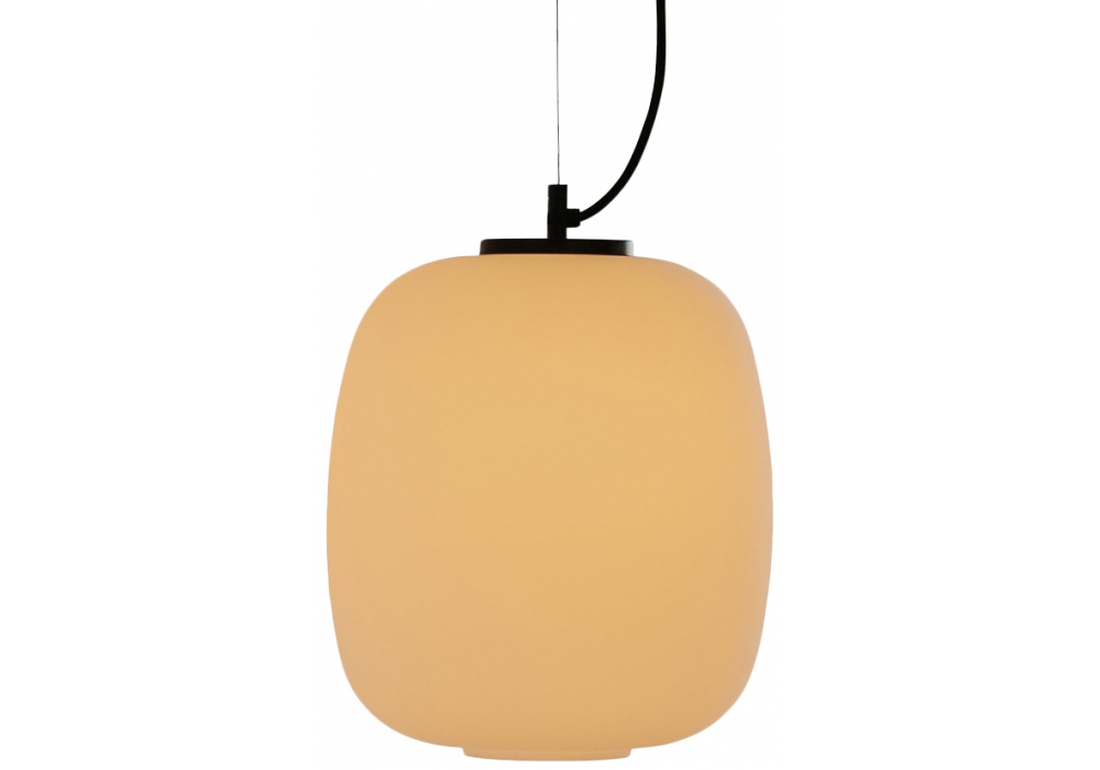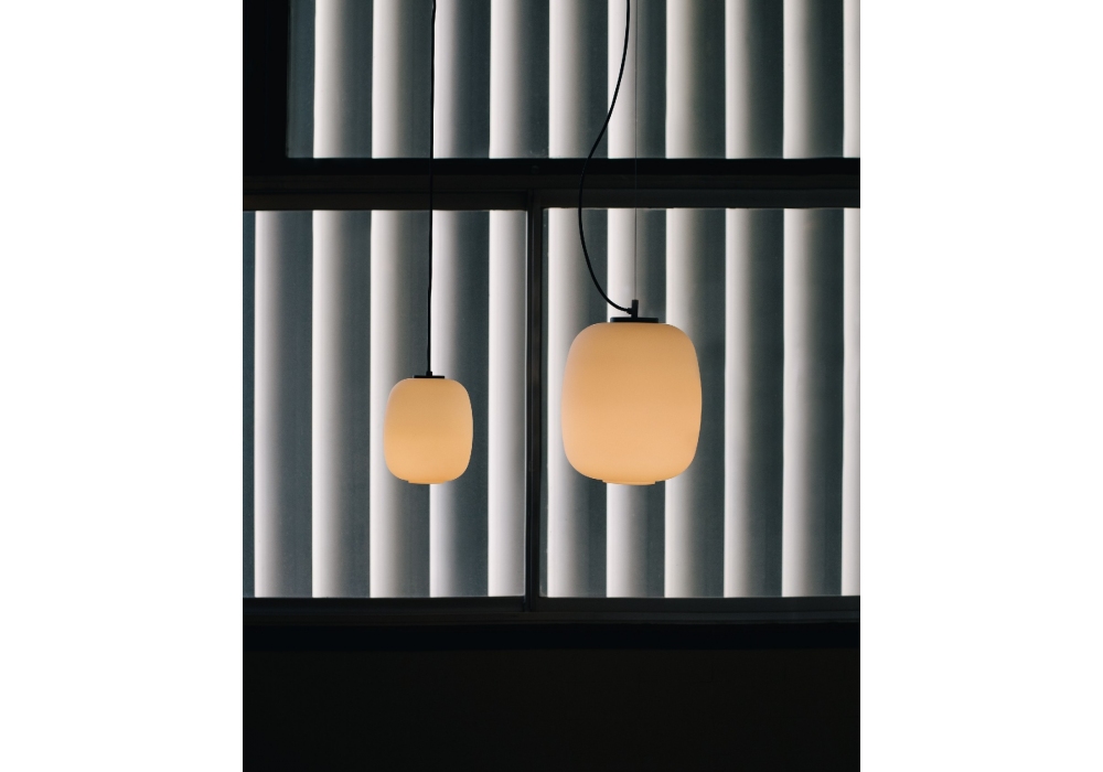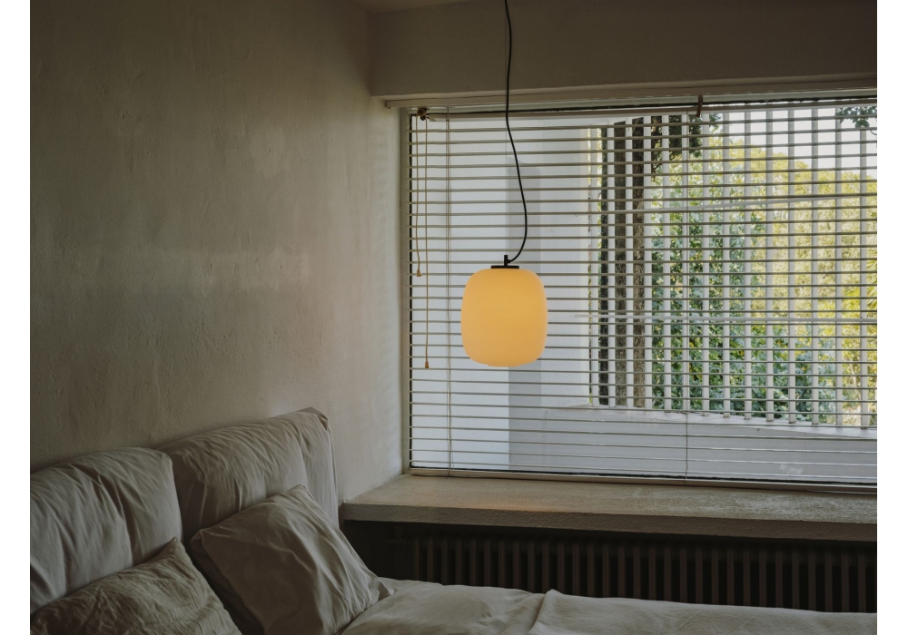 Globo Cesta firmata da Miguel Milá per Santa&Cole è una lampada a sospensione realizzata con paralume in vetro opalino bianco e rosone circolare metallico nero.