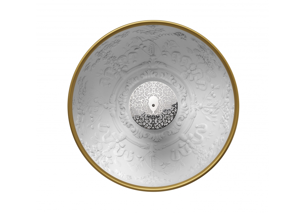 Skygarden Small firmata da Marcel Wanders per Flos è una lampada a sospensione a luce diffusa. Cupola in gesso bianca all'interno. Supporto cupola in lega di alluminio. Diffusore in vetro opalino soffiato. Fregio in acciaio inox fotoinciso ed imbutito. Rosone in PC nel medesimo colore della cupola. Regolabile da remoto (dimmer non incluso). Fonte luminosa LED inclusa.