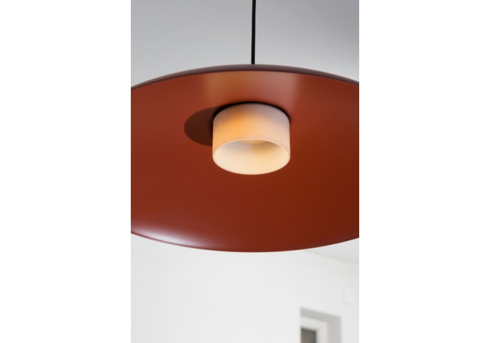 HeadHat Plate S firmata da Santa&Cole è una lampada a sospensione con un diffusore circolare in metallo. Disponibile in vari colori con o senza dimmer.