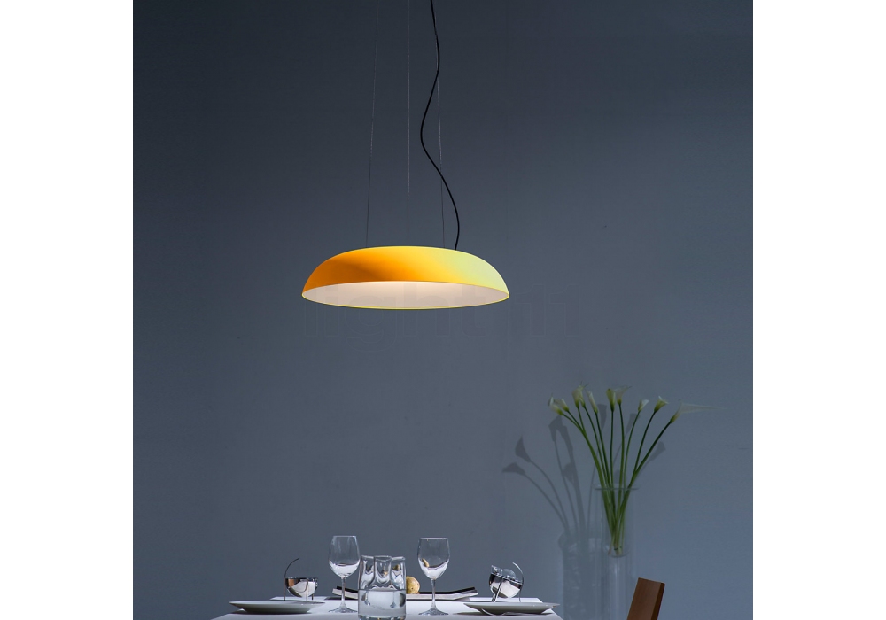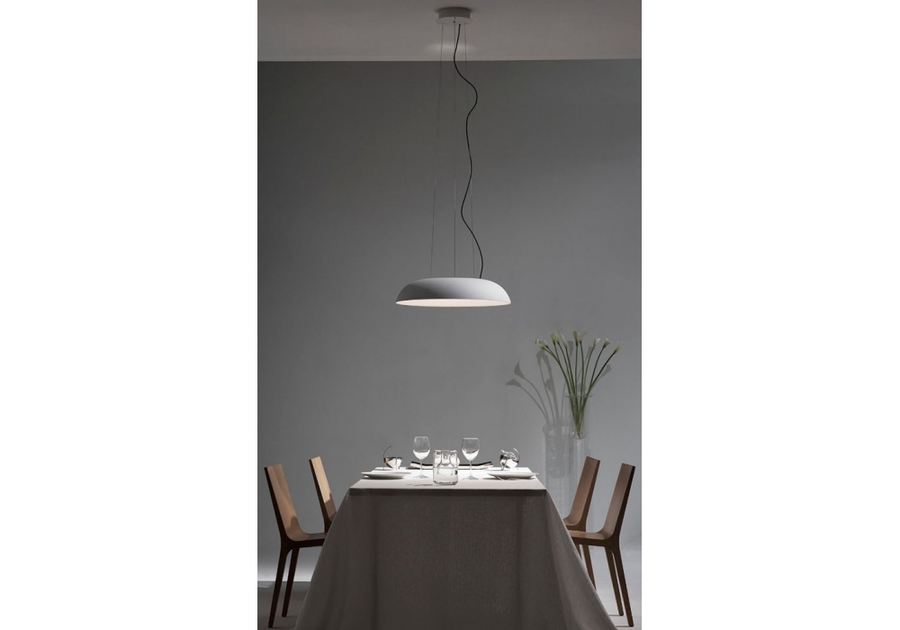 Maggiolone firmato da Emiliana Martinelli per Martinelli Luce è una lampada a sospensione con struttura di forma circolare in alluminio verniciato. Il diffusore è in metacrilato opalino bianco e scherma una sorgente luminosa di tipo LED integrato dimmerabile. Maggiolone è disponibile in differenti finiture e dimensioni.