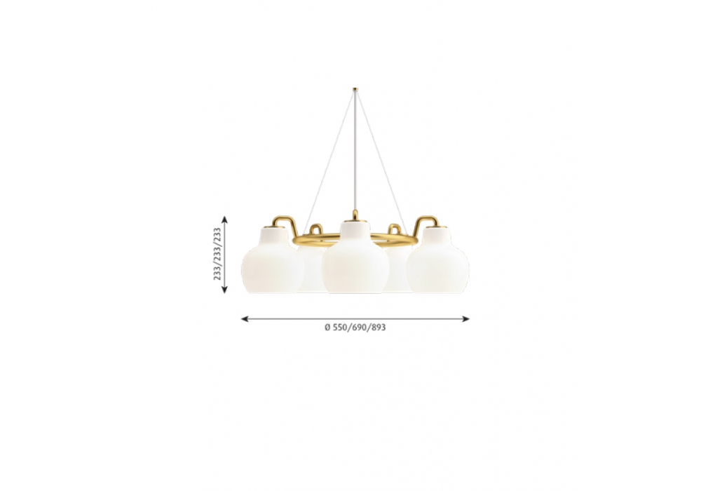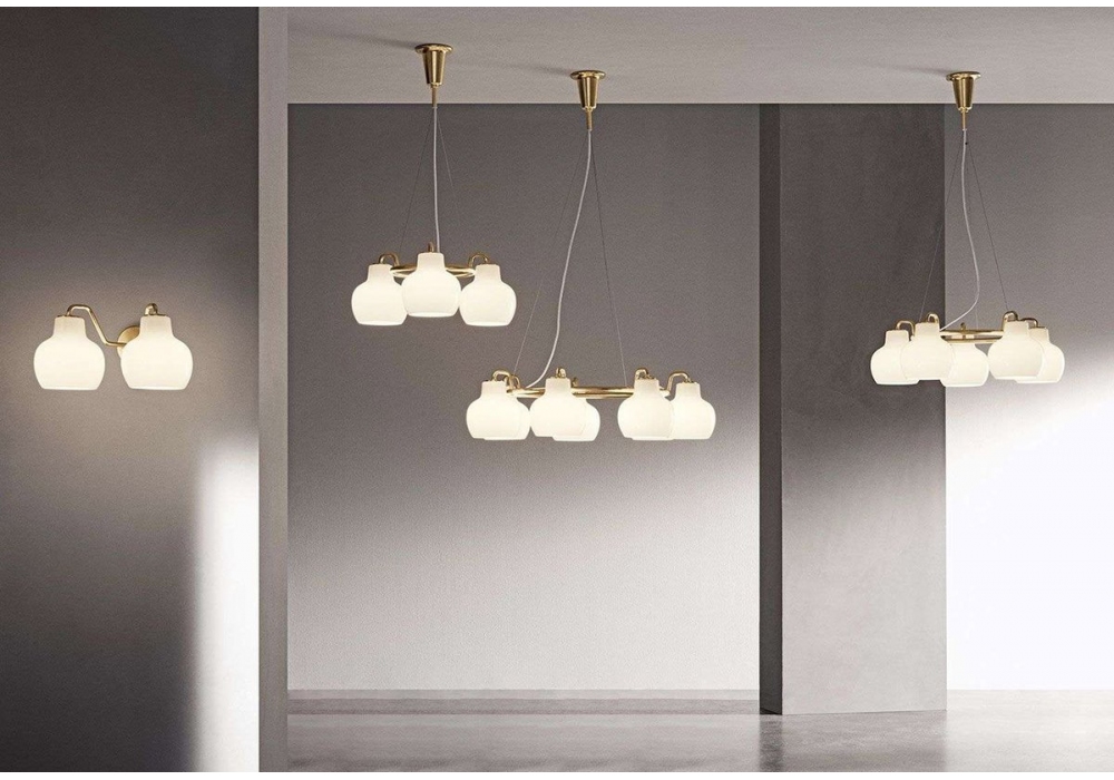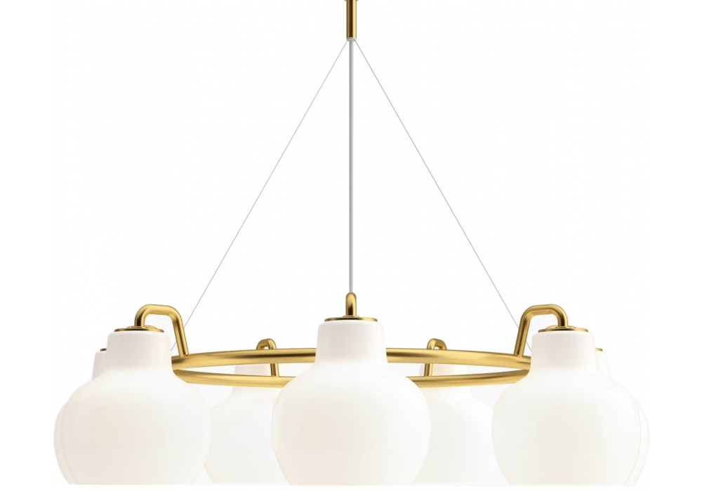 VL Ring Crown 3-5-7 firmata da Vilhelm Lauritzen per Louis Poulsen è una lampada a sospensione con struttura portante in ottone non trattato. I diffusori sono in vetro soffiato oplaino lucido e schermano una sorgente luminosa con innesto E27 di tipo LED o alogeno. VL Ring Crown 3-5-7 è disponibile con 3,5, o 7 punti luce.