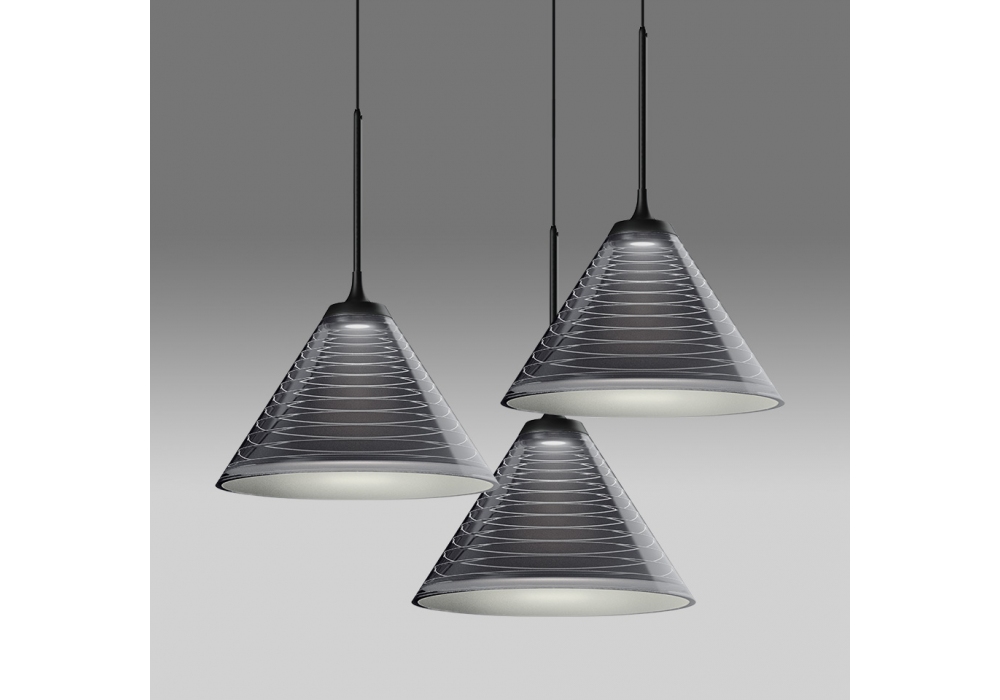 Look at Me Cluster firmata da Alida Catella e Silvio De Ponte per Artemide è una lampada a sospensione multidiffusore con struttura in metallo verniciato nero. I paralumi sono tre di forma conica nero fumè con sorgente luminosa di tipo LED con sistema di dimmerabilità Push App gestibile da remoto. Look at Me Cluster è disponibile in differenti dimensioni.