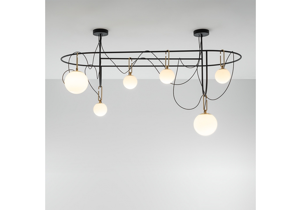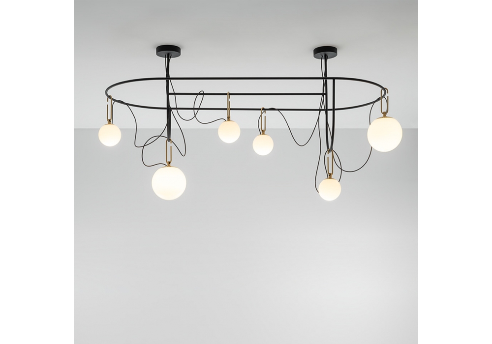 Nh S5 Elliptic firmata da Neri&Hu per Artemide è una lampada a sospensione con struttura ellittica in acciaio verniciato. I diffusori sono sei di forma sferica in vetro soffiato bianco e schermano delle sorgenti luminose di tipo LED dimmerabili. Nh S5 Elliptic è disponibile in differenti finiture.