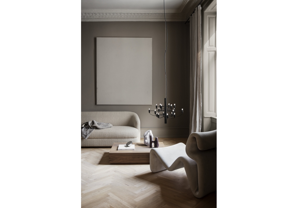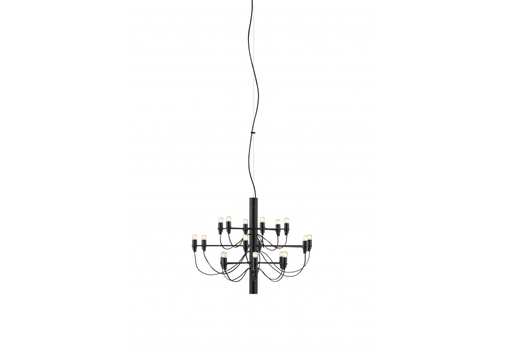 2097/18 firmata da Gino Sarfatti per Flos è una lampada a sospensione a luce diffusa. Struttura centrale in ferro e bracci in ottone. Attacco a soffitto e rosone di acciaio. Regolabile da remoto (dimmer non incluso). Lampadine incluse.