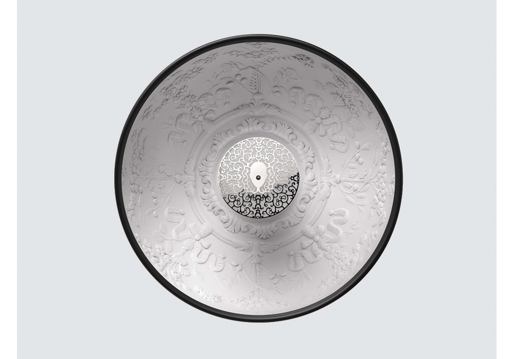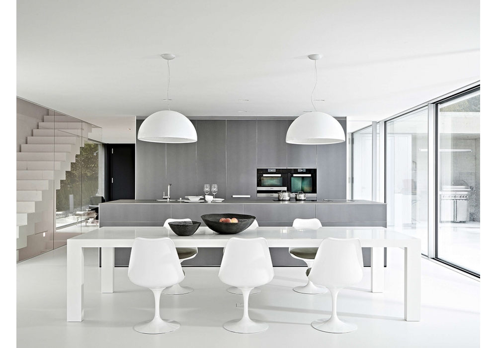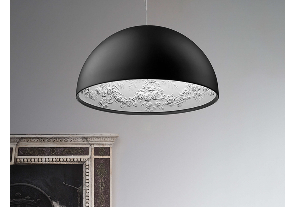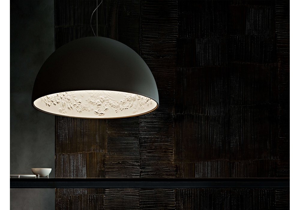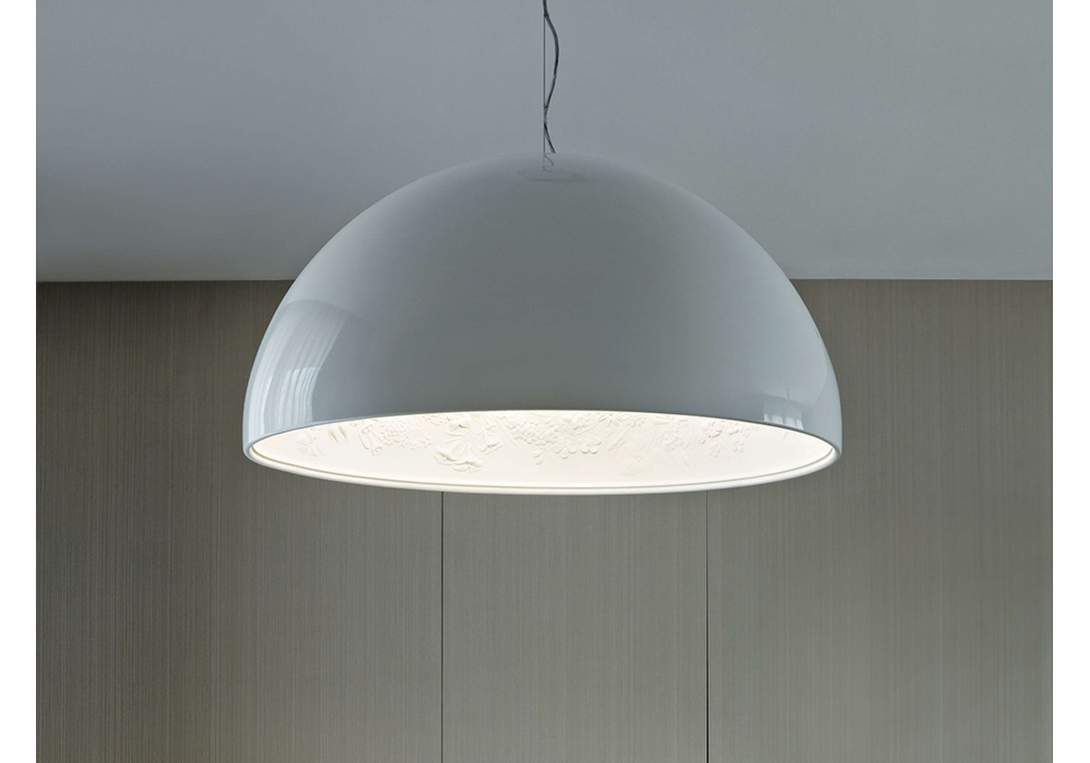 Skygarden 1 firmata da Marcel Wanders per Flos è una lampada a sospensione a luce diffusa. Cupola in gesso bianca all'interno. Supporto cupola in lega di alluminio. Diffusore in vetro opalino soffiato. Fregio in acciaio inox fotoinciso ed imbutito. Rosone in PC nel medesimo colore della cupola. Regolabile da remoto (dimmer non incluso). Fonte luminosa LED non inclusa.