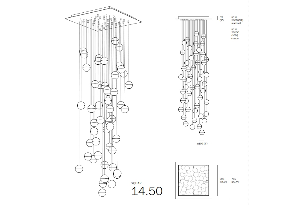 14.50 della serie 14 firmata da Omer Arbel per Bocci è una lampada a sospensione con 36 sfere in vetro, disponibile in tre configurazioni. Ogni sfera è realizzata in vetro borosilicato soffiato. All'interno è presente una cavità che ospita una lampada a led o allo xeno a basso voltaggio. Il vetro è disponibile nel colore trasparente, grigio o ambra. Rosone verniciato a polvere bianco opaco.