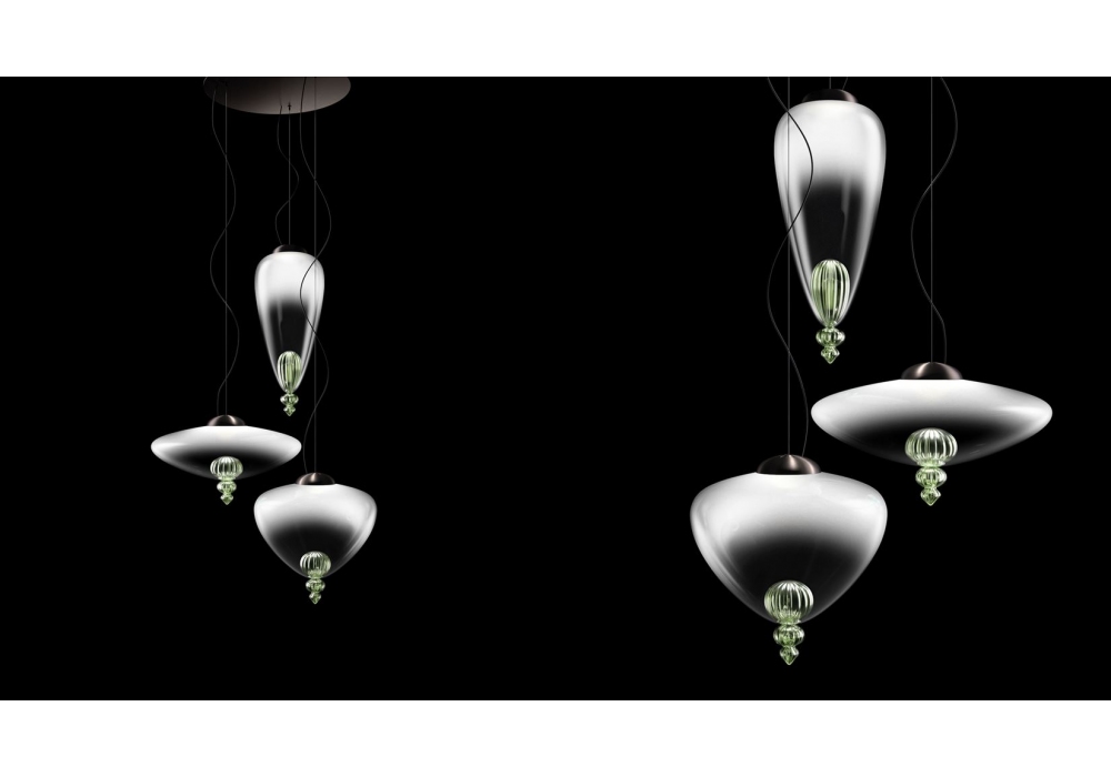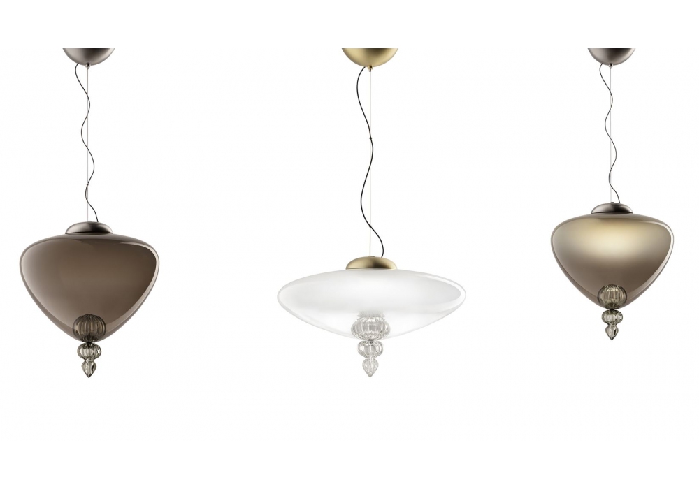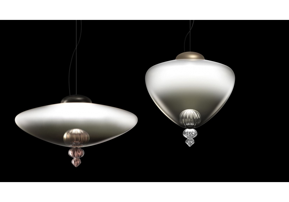 Padma firmata e prodotta da Barovier & Toso è una lampada a sospensione con parti metalliche a vista color nichel nero spazzolato o oro spazzolato. Il diffusore è di forma tondeggiante in vetro veneziano e scherma una sorgente luminosa di tipo LED dimmerabile. Padma è disponibile in differenti modelli e finiture.