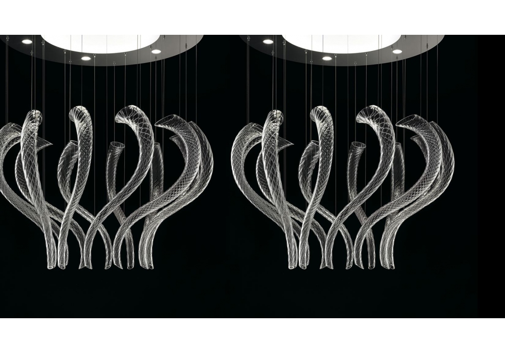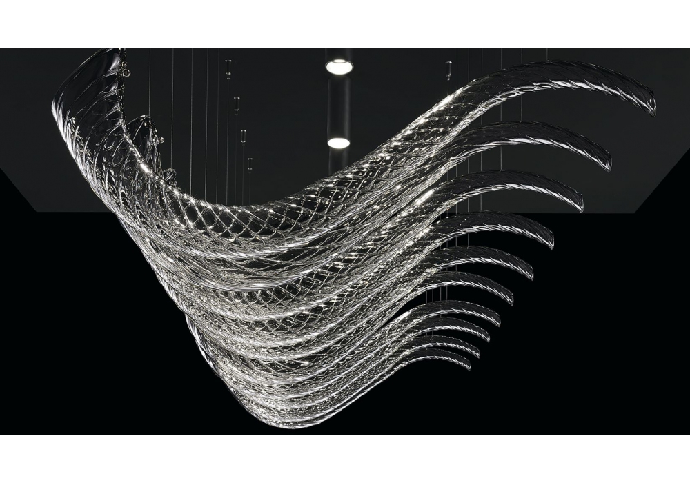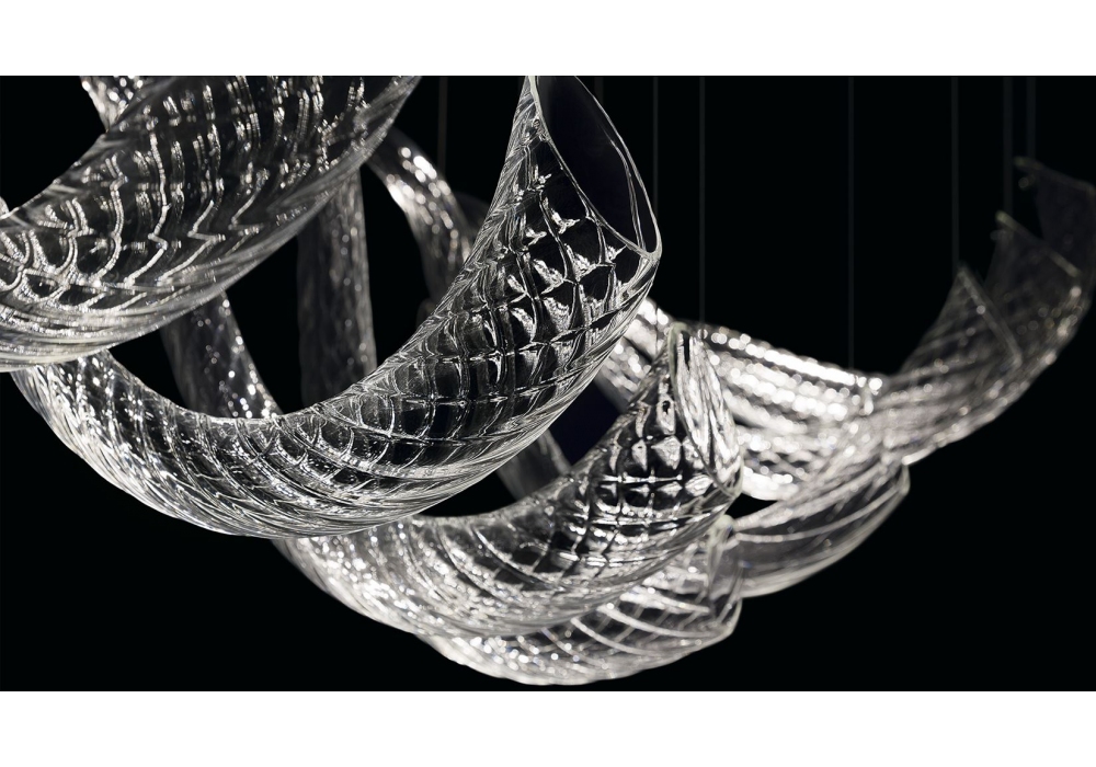 Swing firmata e prodotta da Barovier & Toso è una lampada a sospensione con piastra di ancoraggio al soffitto in metallo color cromo lucido. I pendenti sono in cristallo veneziano e sono disponibili in diverse finiture. Le sorgenti luminose adottate sono di tipo LED dimmerabili. Swing viene prodotta in differenti modelli.