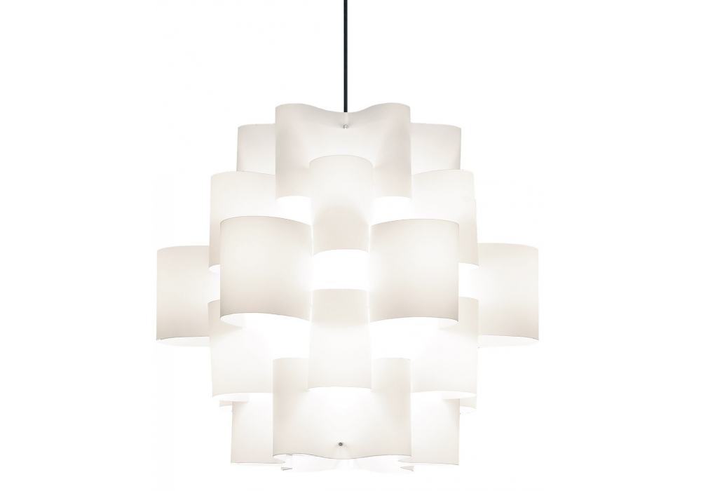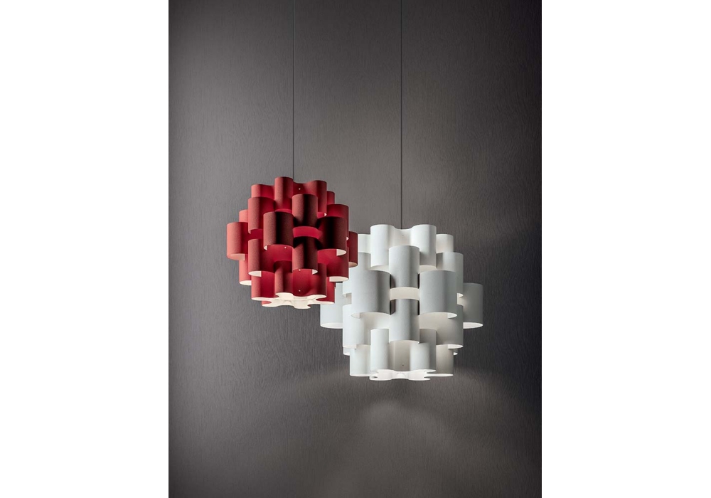 Sun 50 firmata da Brian Rasmussen per Quadrifoglio Group è una lampada a sospensione realizzata incastrando insieme 96 volte sottilissimi fogli di tessuto bianco, rosso o nero. Rosone a soffitto in metallo verniciato bianco.