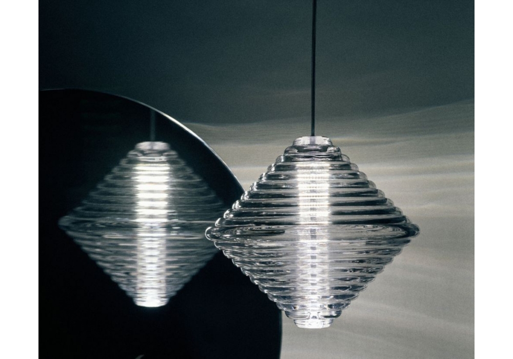 Press Cone firmata da Tom Dixon è una lampada a sospensione realizzata in vetro spesso e trasparente con dettaglio di superficie lineare arrotondato.