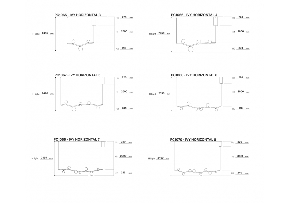 | Dimensioni | PC1065_ 70,5 x H 32 cm; PC1066_ 99 x H 37 cm; PC1067_ 130,5 x H 37 cm; PC1068_ 154 x H 38 cm; PC1069_ 172 x H 39 cm; PC1070_ 200 x H 39 cm. |