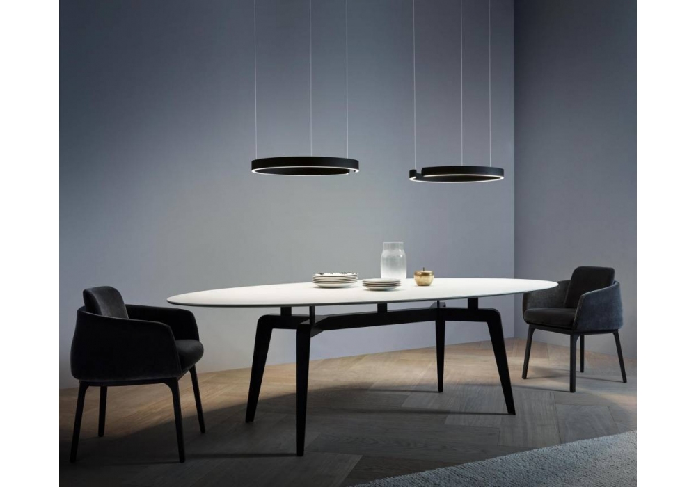 Mito Sospeso 60 firmata da Occhio è una lampada a sospensione a LED regolabile in altezza, tramite il rivoluzionario sistema di gestione dei gesti "touchless control"è possibile calibrare continuamente il colore della luce. É realizzata in alluminio, acciaio verniciato, rivestimento PVD, plastica, silicone ottico e fibra di vetro.