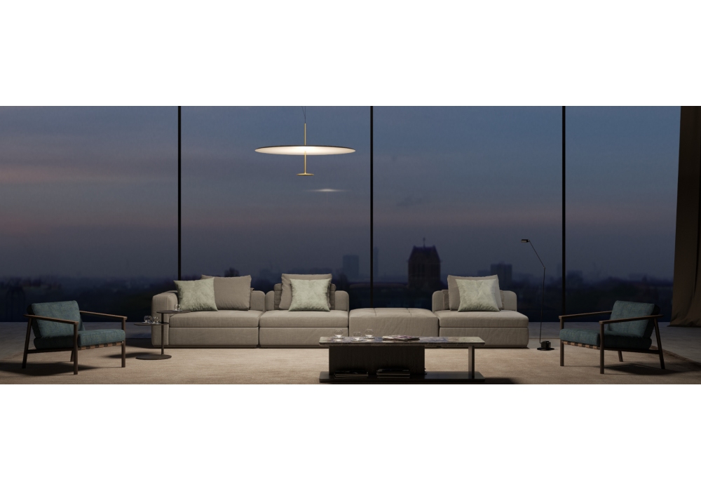 Dot firmata da Foster+Partner per Lumina è una lampada a sospensione strutturata da due dischi paralleli tenuti insieme da uno stelo metallico di colore nero anodizzato o ottone anodizzato. La sorgente luminosa è di tipo LED integrato dimmerabile. Dot è disponibile in due differenti dimensioni con disco da Ø 110 cm o Ø 80 cm.