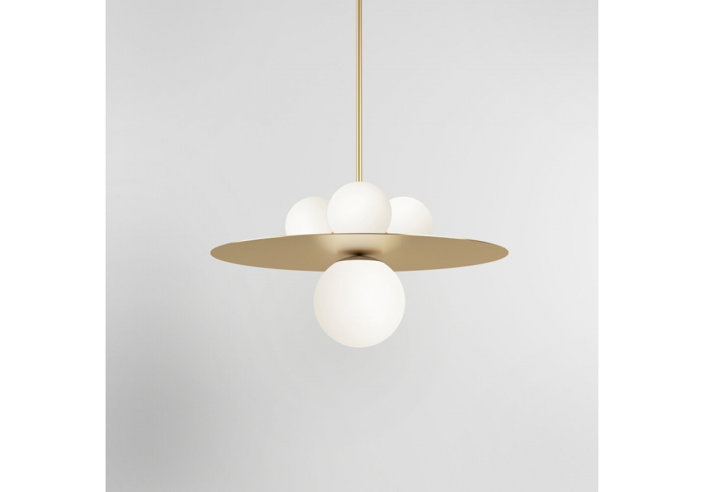 Plate and Spheres firmata da Atelier Areti è una lampada a sospensione realizzata in ottone spazzolato e sfere in vetro bianco.
