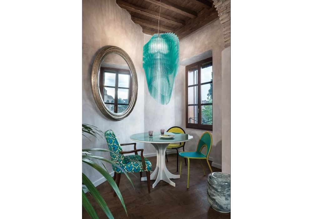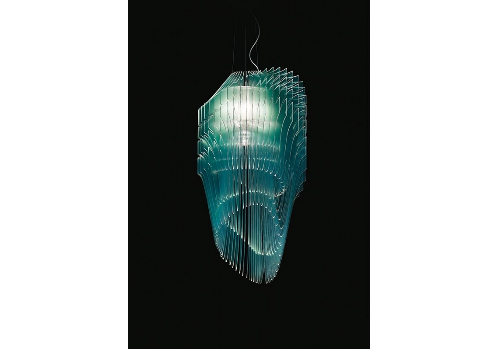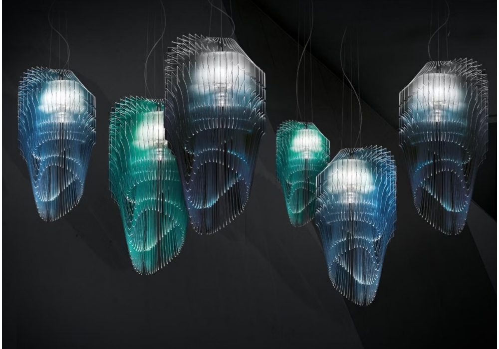 Avia Edition firmata da Zaha Hadid per Slamp è una lampada a sospensione di forma circolare con struttura portante in metallo. Il diffusore è arricchito da vari elementi in Cristalflex® o Lentiflex® e schermano delle sorgenti luminose di tipo LED dimmerabile. Avia Edition è disponibile in differenti finiture.
