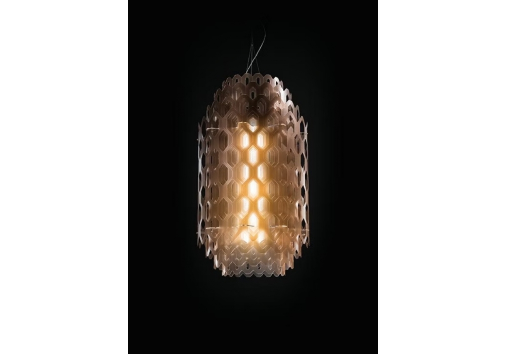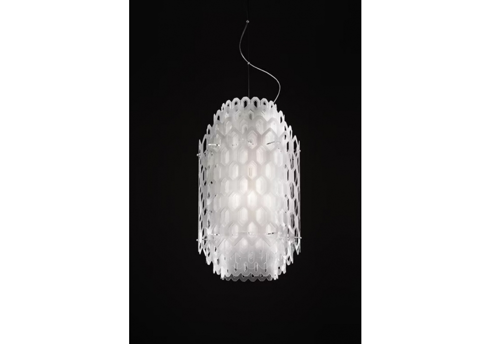 Chantal firmata da Doriana e Massimiliano Fuksas per Slamp è una lampada a sospensione a cilindri concentrici in Cristalflex® o Lentiflex®. Il diffusore ha una superficie traforata e scherma una sorgente luminosa di tipo LED a filamento dimmerabile. Chantal è disponibile in differenti finiture.