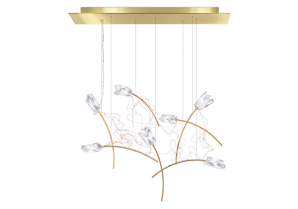 Tulip Linear firmata da Marc Sadler per Slamp è una lampada a sospensione con struttura portante in metallo di forma quadrangolare e pendenti in Lentiflex® ed ottone opaco spazzolato. Le sorgenti luminose adottate sono di tipo LED dimmerabile. Tulip Linear è disponibile in differenti modelli.