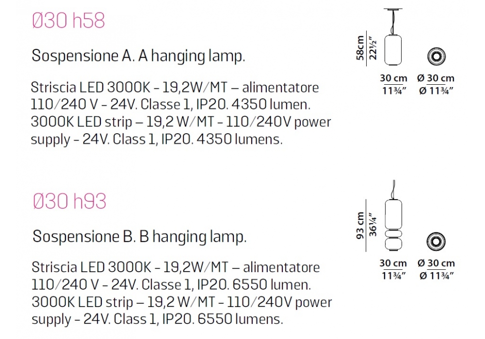 | Dimensioni | Ø 30 x H 58 cm; Ø 30 x H 93 cm. |