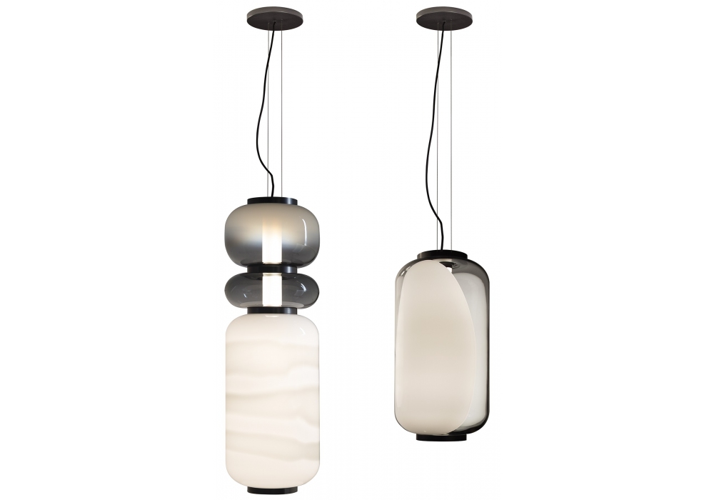 Haiku firmata da Baxter P. è una lampada a sospensione con struttura e dettagli in nickel spazzolato semi-opaco. Paralume in vetro soffiato temperato grigio acciaio, con sfumatura: trasparente; sfumato; incamiciato bianco e incamiciato bianco a fasce. Lampada con fonte luminosa a led. Disponibile in 2 modelli.