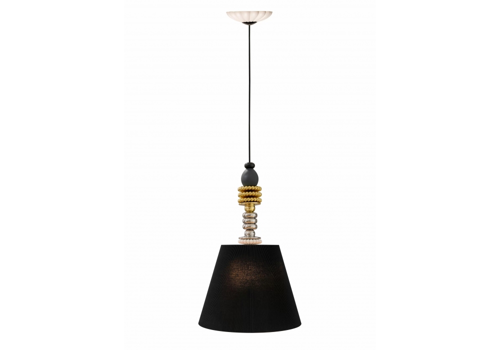 Firefly scolpita da Dept. Diseño y Decoración e firmata da Olga Hanono per Lladró è una lampada a sospensione. Le decorazioni che adornano il cavo di alimentazione sono in porcellana realizzate e dipinte a mano, mentre il diffusore è in tessuto di colore nero.