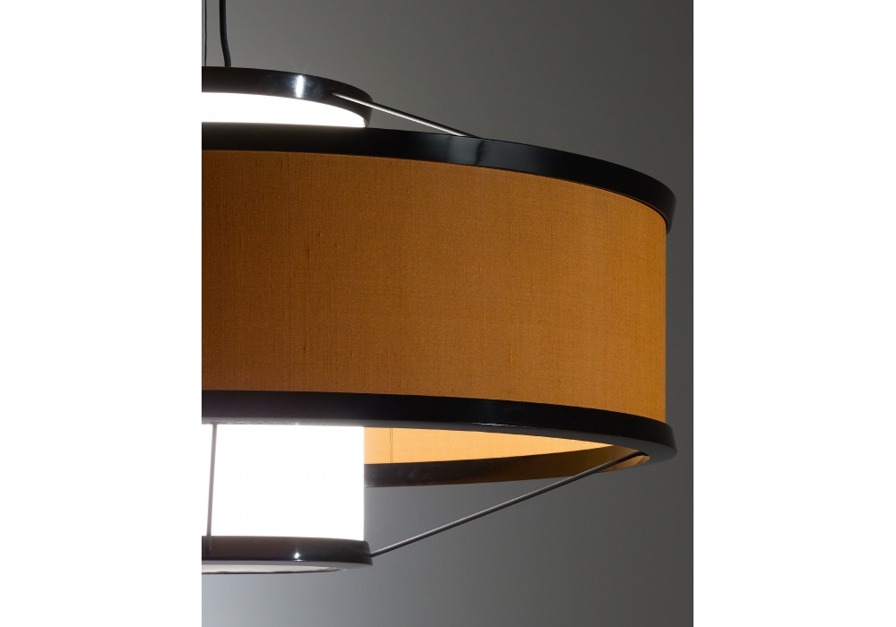Obon firmata da Draw Studio per Ceccotti Collezioni è una lampada a sospensione ispirata alle tradizionali lanterne giapponesi. La lanterna al centro è in vetro opalino bianco, i due anelli esterni sono in noce canaletto, il paralume è rivestito in seta e le aste che la collegano al centro sono in bronzo brunito.