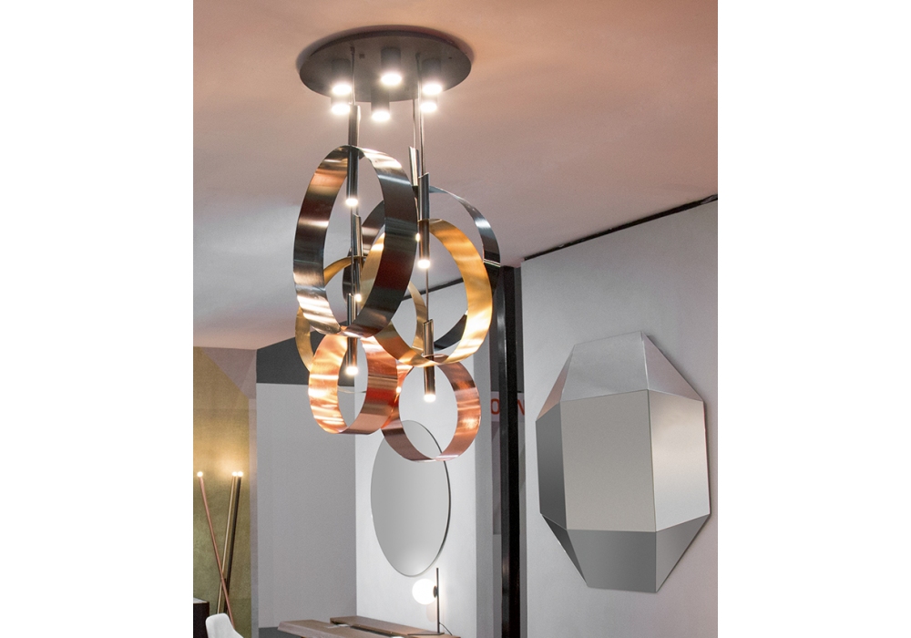Led Loop S6 firmata da Riflessi è una lampada a sospensione formata da sei anelli in tre diverse dimensioni. Dalla base scendono sei faretti luminosi fissi con sei anelli verniciati ( 2 rame, 2 oro, 2 cromo nero) con trattamento satinato galvanico, collegati a cavi elettrici in tessuto nero regolabile in altezza min. 60 max. 120 cm. Su richiesta è possibile progettare i diffusori nella stessa finitura.
