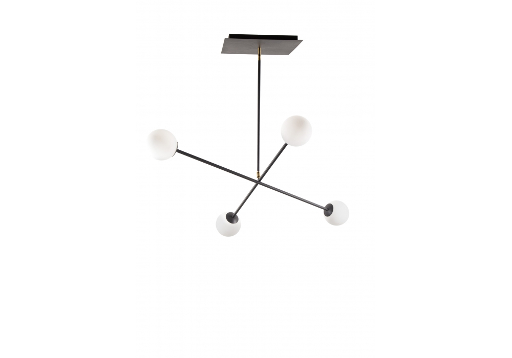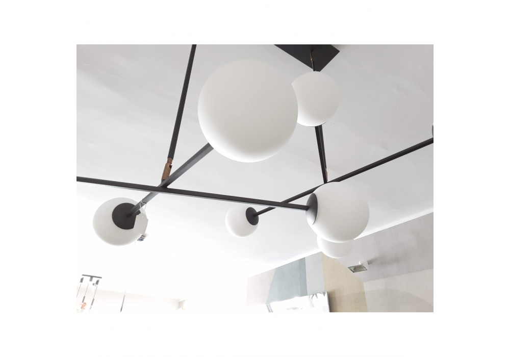 Struttura metallica con verniciatura a fuoco epossidica. Cavo elettrico in tessuto nero. La fonte luminosa proviene da bulbi in vetro bianco satinato. Disponibile in diversi modelli e finiture.