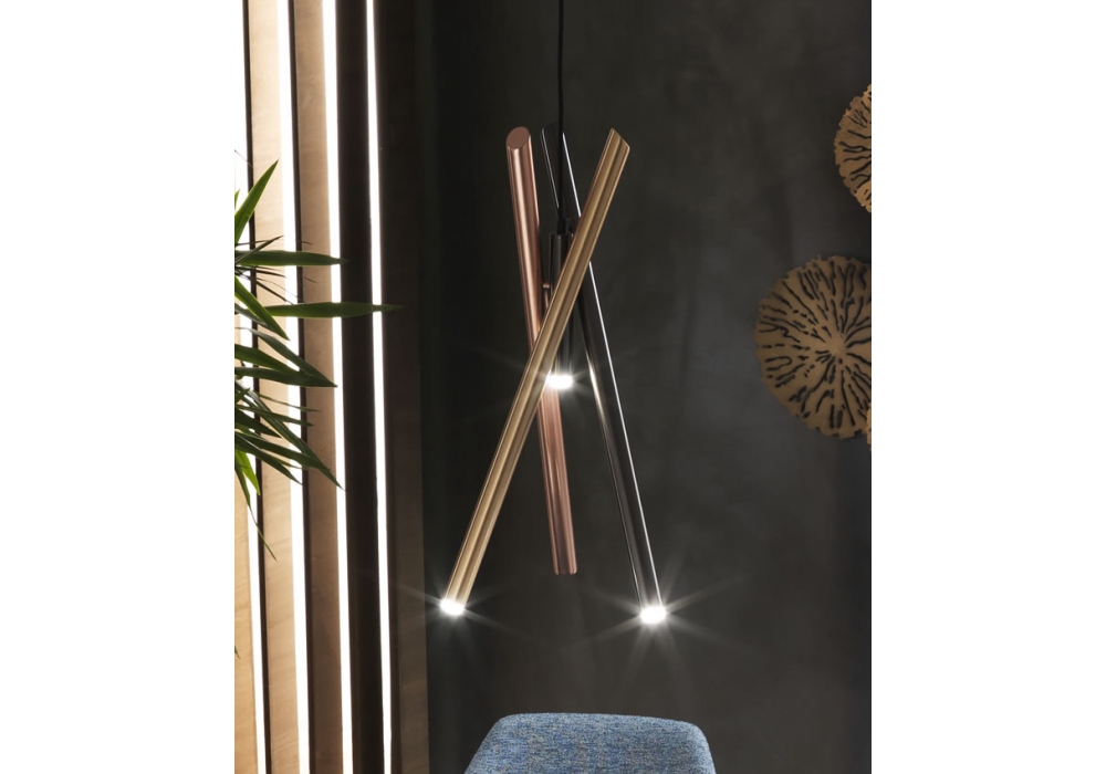 Shangai S6 firmata da Riflessi è una lampada a sospensione composta da tre tubolari metallici verniciati con trattamento satinato galvanico. Nella versione small la lampada è composta da tre luci LED direzionali. Nella versione big la lampada è composta da tre luci LED direzionali + 1 luce LED fissa. Cavo elettrico in tessuto nero regolabile in altezza max. 120 cm. Disponibile in diverse finiture.