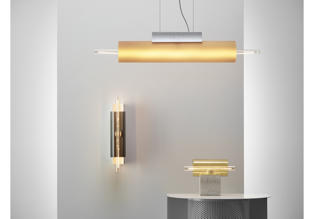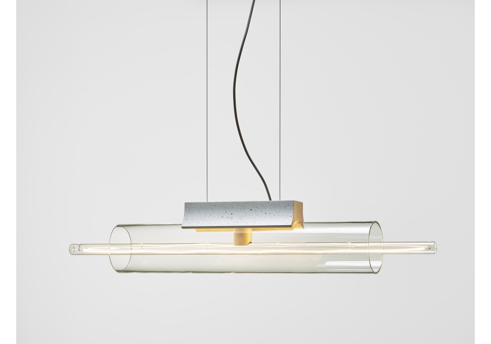 Overlay firmata da Lucie Koldova per Brokis è una lampada a sospensione con struttura portante in cemento ultraperformante. Il diffusore è di forma tubolare in vetro soffiato con superficie lucida o acidata e scherma una sorgente luminosa di tipo LED. Overlay è disponibile in differenti finiture.