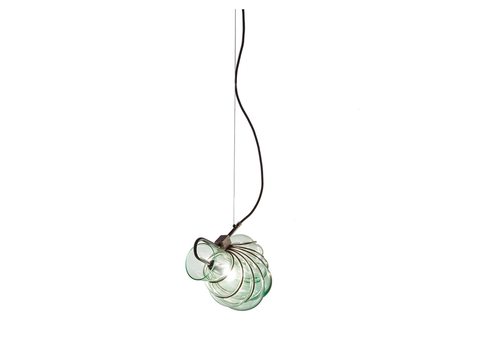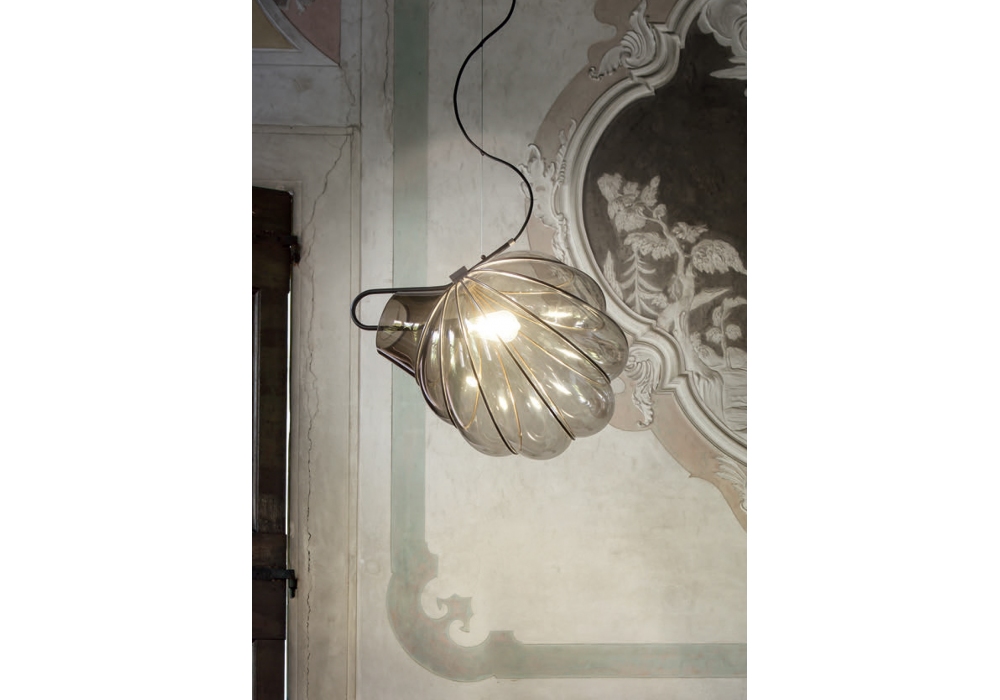 Dedicato firmata da Domenico Rinaldi per Fisionarte è una lampada a sospensione con struttura in crudo acciaio e montatura verniciata nera opaca. Il diffusore è di forma tondeggiante in vetro di murano ed alloggia una sorgente luminosa con innersto E27 o E14 alimentatata da un cavo in fibra tessile di colore nero. Dedicato è disponibile in differenti modelli e finiture.
