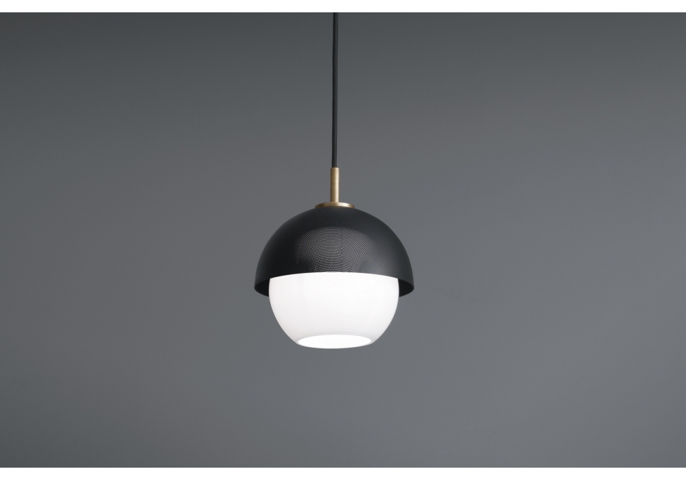Urban 1 disegnata da Massimo Tonetto per Venicem è una lampada a sospensione a luce diffusa. Struttura in ottone brunito chiaro o scuro con paralume in metallo traforato oro opaco o nero opaco. Diffusore in vetro soffiato di Murano bianco. Disponibile in varie dimensioni.