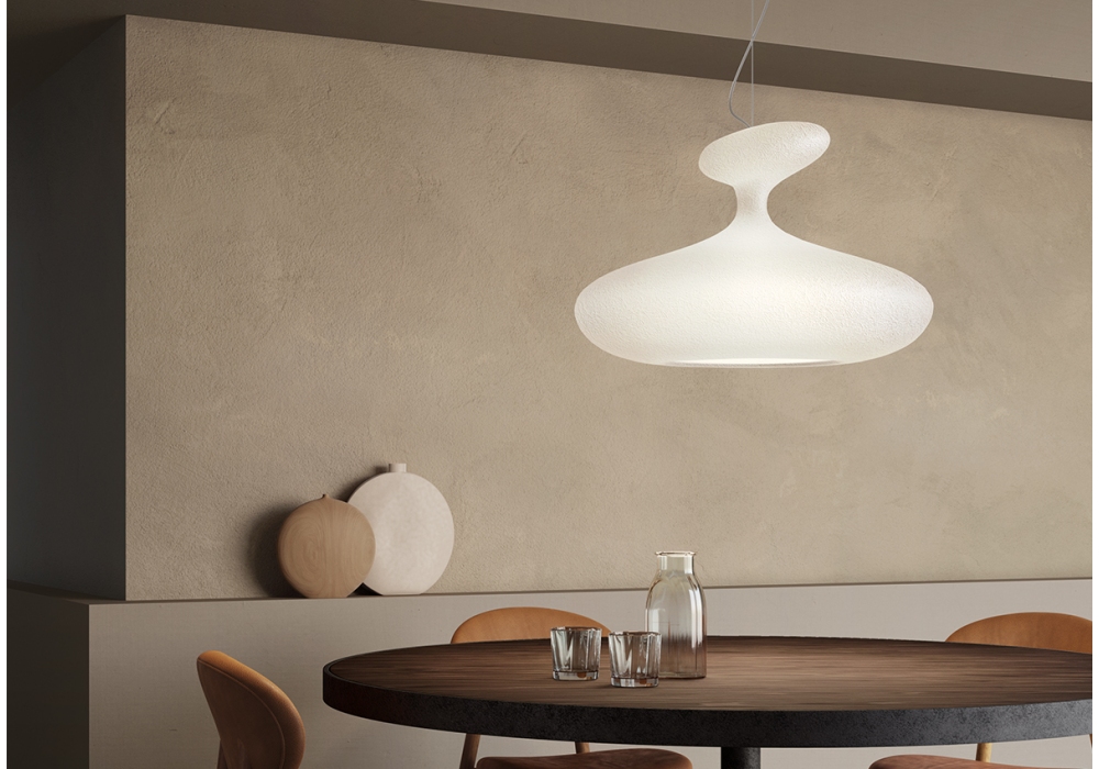 E.T.A. SAT firmata da Guglielmo Berchicci per Kundalini è una lampada a sospensione con diffusore in vetroresina ecologica