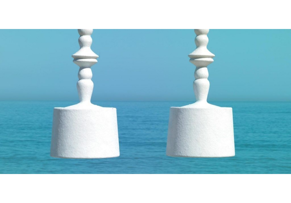 Alibabig Outdoor firmata da Matteo Ugolini per Karman è una lampada a sospensione in fibra di vetro bianca con rosone in metallo bianco opaco. Lampada a sospensione dotata di due LED.