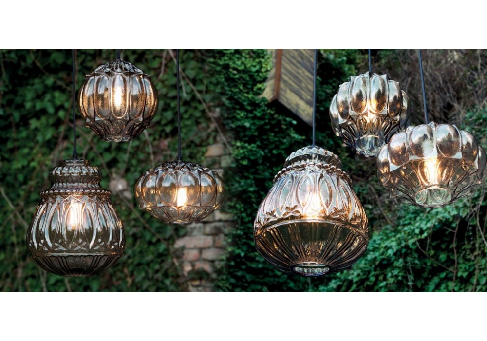 Ginger Outdoor firmata da Matteo Ugolini per Karman è una lampada a sospensione con rosone in metallo laccato trasparente e diffusore in vetro paglierino o fumè. Disponibile in differenti dimensioni. Uso esterno. Lampadina non inclusa.