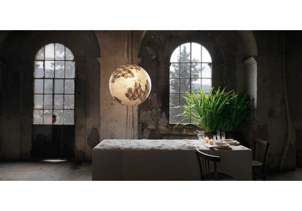 Ululà Outdoor firmata da Matteo Ugolini per Karman è una lampada a sospensione in vetroresina e pizzo bianco.