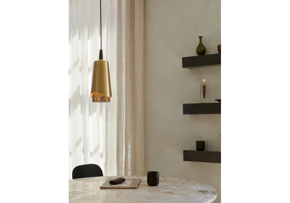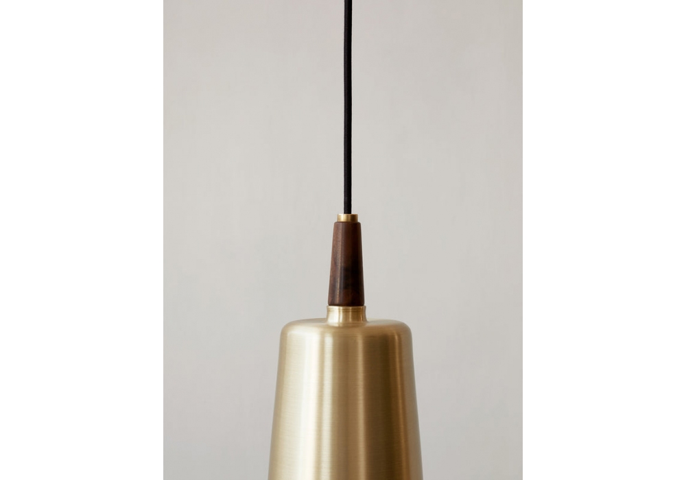 Umanoff firmata da Arthur Umanoff per Audo Copenhagen è una lampada a sospensione realizzata in ottone massiccio, acciaio placcato e noce massello.