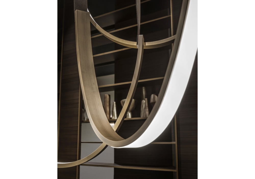 Mayline firmata da Adele Martelli per Emmemobili è una lampada a sospensione con anello realizzato in ottone con fasce in pelle marrone. Illuminazione con strisce LED posizionabile verso l’alto o verso il basso. Le fasce, che coprono i 2 cavi di sostegno e il cavo elettrico, hanno lunghezza standard massima di cm.200. Versione dimmerabile disponibile a richiesta e con sovrapprezzo.