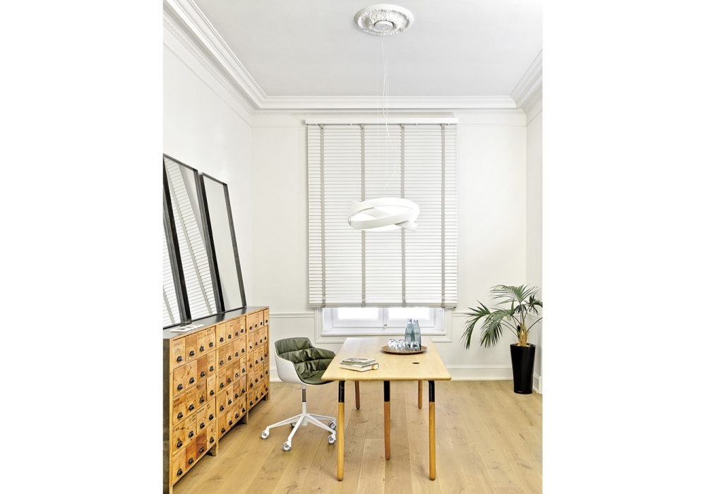 Siso Large firmata da Estudi Ribaudí per Estiluz è un lampada a sospensione con paralume in vetro bianco satinato e anelli decorativi in alluminio. La sorgente luminosa adottata è con innesto E27 di tipo LED dimmerabile.