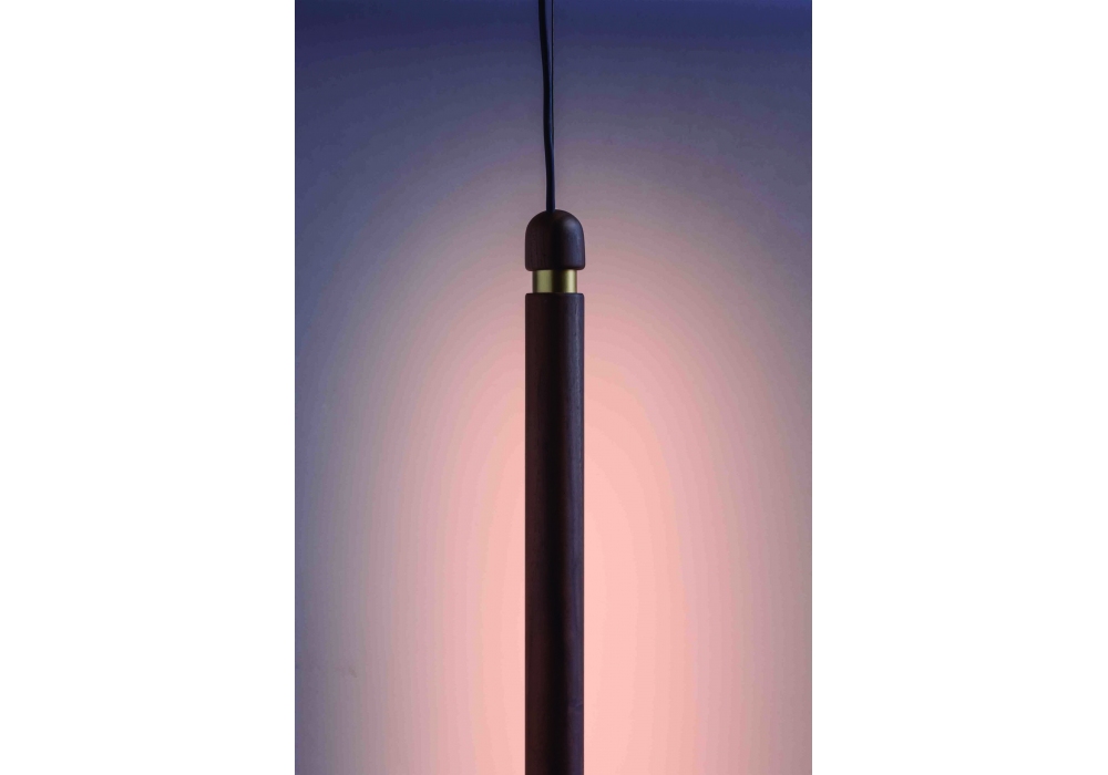 Linea V firmata da Andrés Martínez per Nomon è una lampada a sospensione con struttura in legno di noce, con dettagli in ottone lucido o metallo finitura grafite.