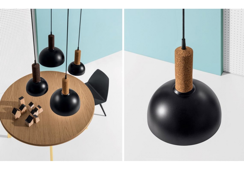 Korlux Semispherical firmata da Discipline Lab è una lampada a sospensione con struttura in sughero naturale o nero e diffusore semisferico in metallo. Disponibile in diverse finiture e dimensioni.
