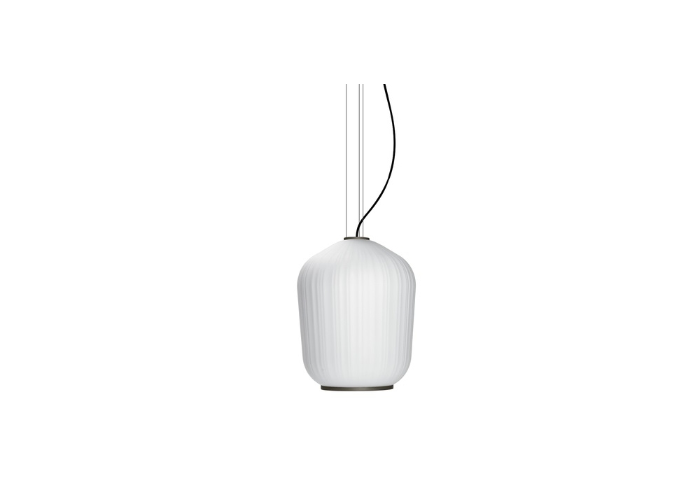 Plissée firmata da Sebastian Herkner per ClassiCon è una lampada a sospensione realizzata con anello in alluminio. Paralume in vetro opalino satinato bianco soffiato a mano con superficie plissettata.