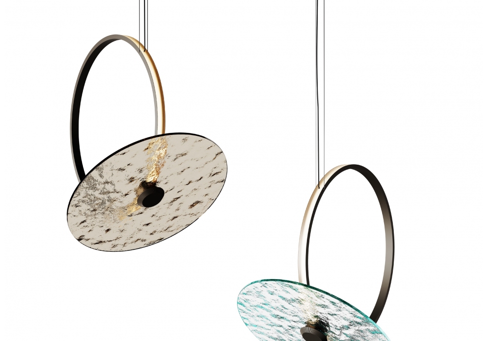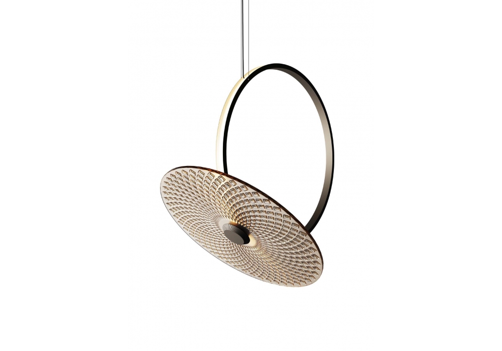 Marry Me firmata da Davide Oppizzi per Fiam è una lampada a sospensione per interni con struttura ad anello in alluminio finitura Mid-Bronze e diffusore in materiale plastico bianco opale. Fonte luminosa a LED integrata nella struttura. Diffusore decorativo in vetro extralight, fumè o bronzo fuso a gran fuoco, disponibile in 2 varianti di texture: "organica " o "geometrica"