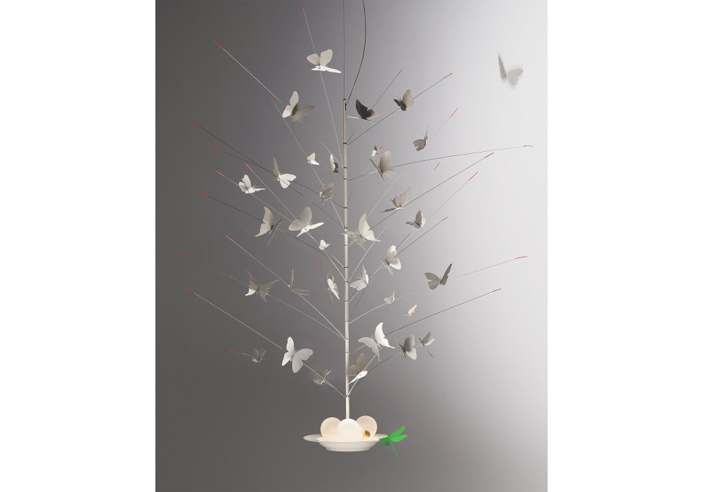 La Festa delle Farfalle firmata e prodotta da Ingo Maurer è una lampada a sospensione con 34 farfalle, una libellula in carta e 3 lampadine appoggiate su un piatto. LED integrati nel piatto in porcellana emettono luce verso l’alto e basso.
