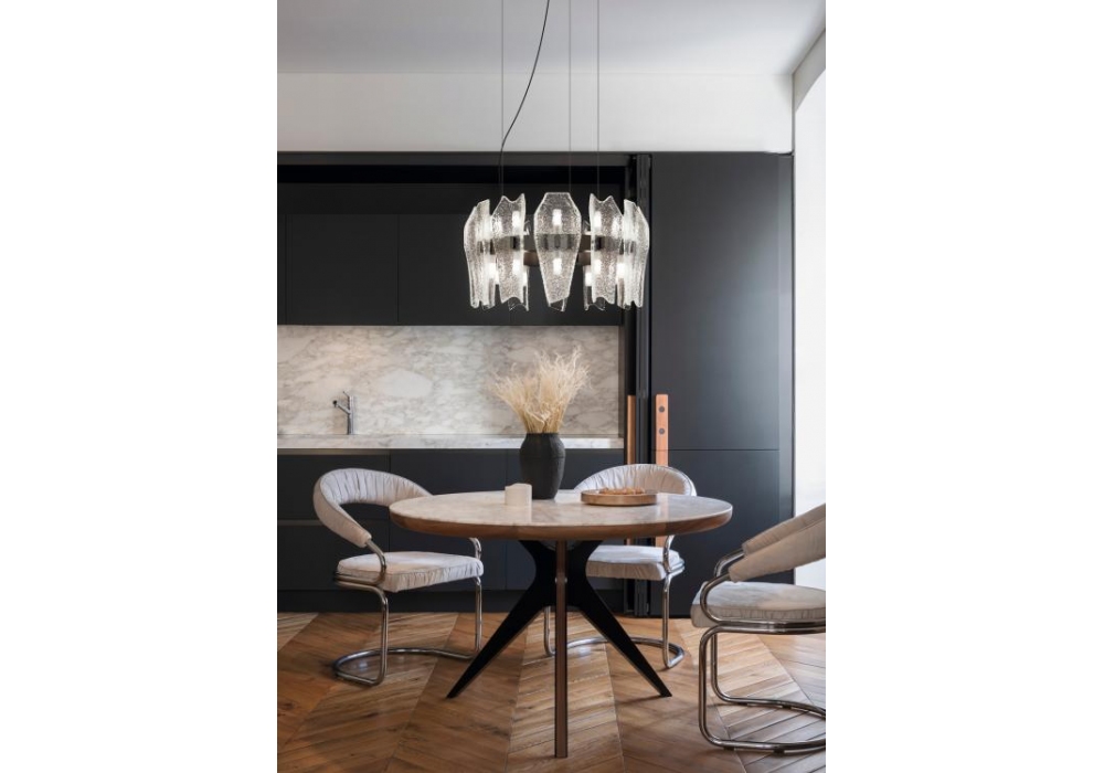 Punk firmata da Roberto Lazzeroni per Barovier & Toso è una lampada a sospensione ad 1 o più livelli con struttura portante e particolari in metallo color nichel nero spazzolato o oro spazzolato. Il diffusore è composto da più applicazioni in vetro