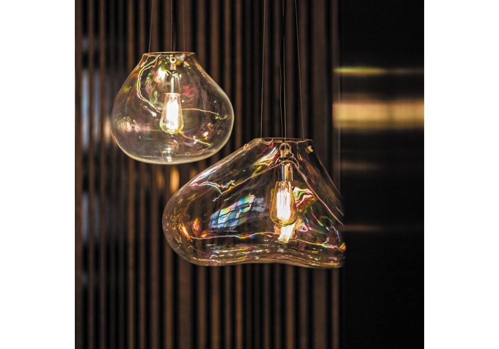 Bolla firmada da Studio Harry-Paul per Fontana Arte è una lampada a sospensione a luce diffusa dimmerabile. Diffusore in vetro soffiato a fermo trasparente con effetto iridescente. Cavi di sospensione in acciaio. Cavo di alimentazione tessuto blu. Rosone in materiale termoplatico cromato. Disponibile in differenti dimensioni.