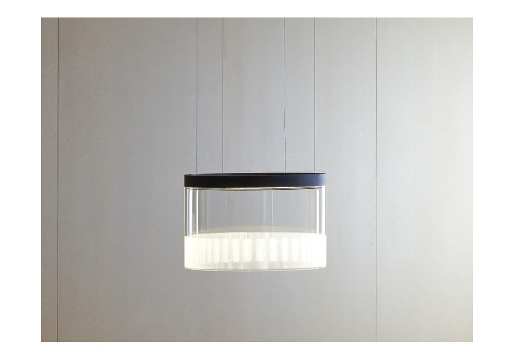 Guise Circular firmata da Stefan Diez per Vibia è una lampada a sospensione con rosone in acciaio e profilo in alluminio color grafite opaco. Il diffusore è in vetro borosilicato di forma cilindrica e scherma una sorgente luminosa di tipo LED dimmerabile. Guise Circular è disponibile in diversi modelli e versioni di controllo della sorgente di luce.
