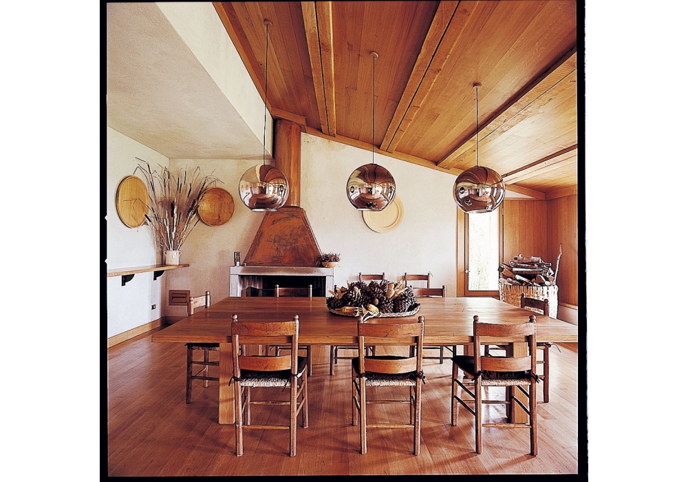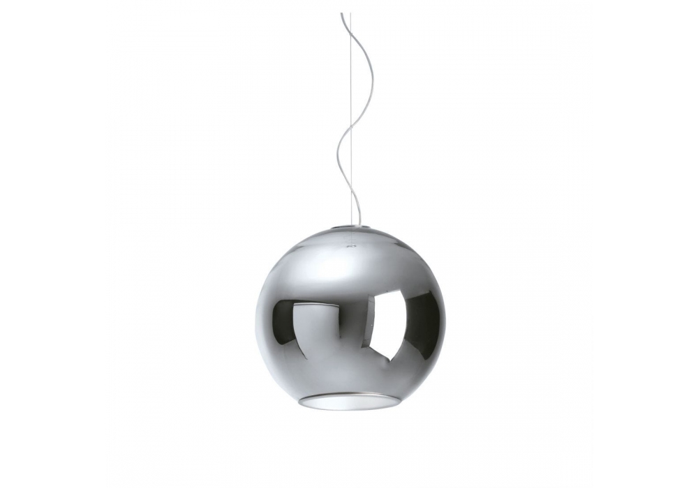 Globo Di Luce firmato da Roberto Menghi per Fontana Arte è una lampada a sospensione con cavo di sospensione in acciaio e corpo lampada di forma sferica in vetro soffiato metallizato nelle finiture rame o cromo. Il diffusore interno è in alluminio brillantato.
